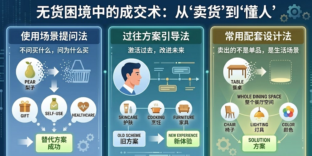 我们将结合销售场景与实际策略,从“使用场景提问法”、“过往方案引导法”与“常用配套设计法”三方面深入展开,带你掌握在无货可售的困境中,如何不仅保住客户,还能成交更多。