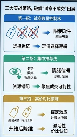 门店应设定内部标准,如一位顾客连续试穿超过5套服装时,销售需自动切换为“引导决策模式”,即不再鼓励更多试穿,而是将注意力集中在已试项目的利弊分析上。
