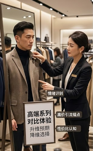 “这款是我们高端系列,您试下对比一下手感和剪裁,虽然贵一些,但穿着体验是完全不一样的。”不是推销,而是“提供对比体验”,以弱推荐方式破除顾客的防备心。