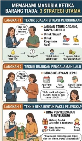 Di syarikat kami yang menjalankan kajian psikologi jualan dan latihan praktikal, kami sering tekankan prinsip ini: jualan bukan tentang “saya ada apa yang anda mahu”, tetapi “anda ada masalah, saya bantu selesaikan.” Bila pelanggan mahukan sesuatu yang tiada dalam stok, di situlah kemahiran anda dalam mengalih keperluan dan memahami manusia akan benar-benar teruji.
