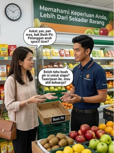 Ambillah sedikit masa dan fikirkan: bila seorang pelanggan berkata “Saya nak beli buah pir”, adakah keperluan sebenar dia hanya semata-mata nak beli buah pir? Adakah kerana dia suka rasa buah pir? Atau untuk seseorang di rumah yang sakit dan perlukan vitamin? Atau hanya sebab dia dah biasa beli? Kalau anda tidak tanya, anda tidak akan benar-benar faham keperluannya. Maka, segala cadangan yang anda berikan boleh jadi hanya satu ‘ganti yang anda fikir sesuai’, bukannya ‘penyelesaian yang dia perlukan’.