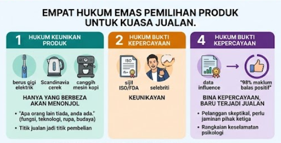 Dalam dunia jualan, terdapat satu pepatah: “Kalau tersalah pilih produk, semua usaha jadi sia-sia.” Kedengaran agak mutlak, tetapi dalam dunia sebenar, inilah kenyataannya. Jika anda memilih produk yang sukar dijual, walaupun anda memiliki teknik jualan yang hebat dan saluran promosi yang canggih, hasilnya tetap mengecewakan. Sebaliknya, jika anda bijak mengenal pasti trend pasaran dan memilih produk yang betul, walaupun kemahiran jualan anda biasa-biasa sahaja, anda masih boleh menembusi pasaran dengan pantas melalui daya tarikan produk itu sendiri.
