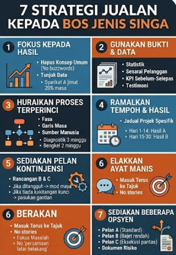Bos singa hanya percaya kepada bukti. Sediakan statistik, senarai pelanggan serupa, perbandingan KPI sebelum dan selepas, serta testimoni. Mereka lebih percaya data pasaran daripada slogan jualan.